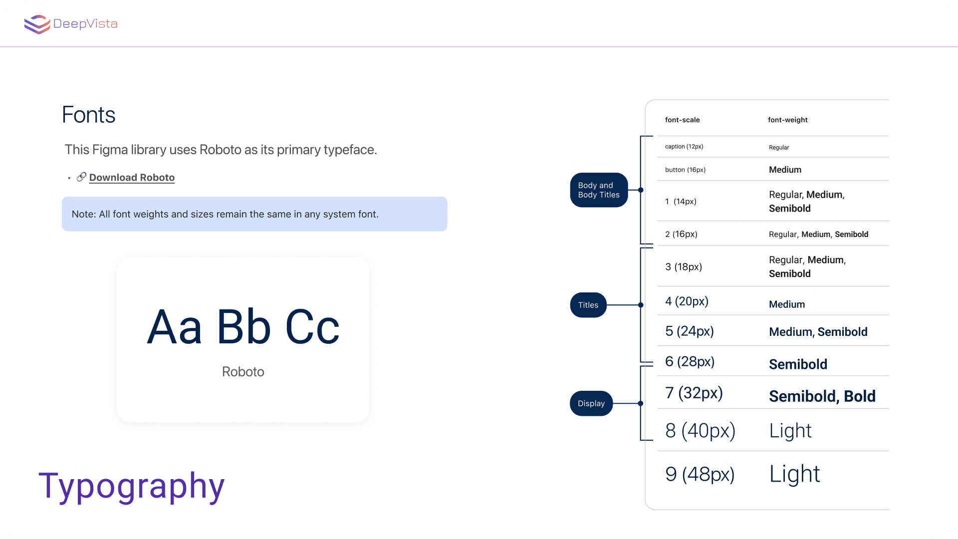 Typography → Roboto with geometric tone for both interface & marketing