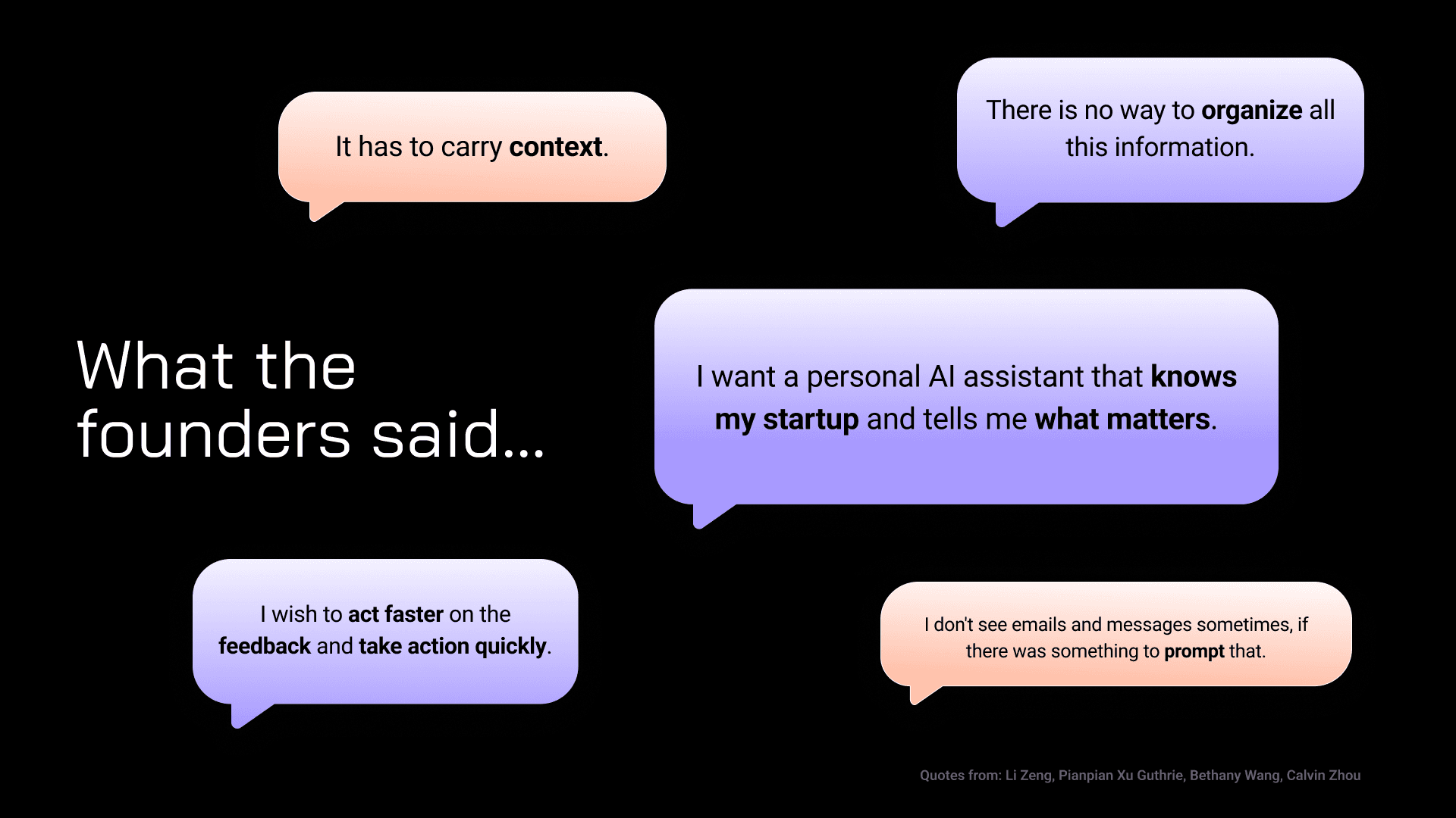 “I want a personal AI agent that knows my startup and tells me what matters.” — Li Zeng, Founder