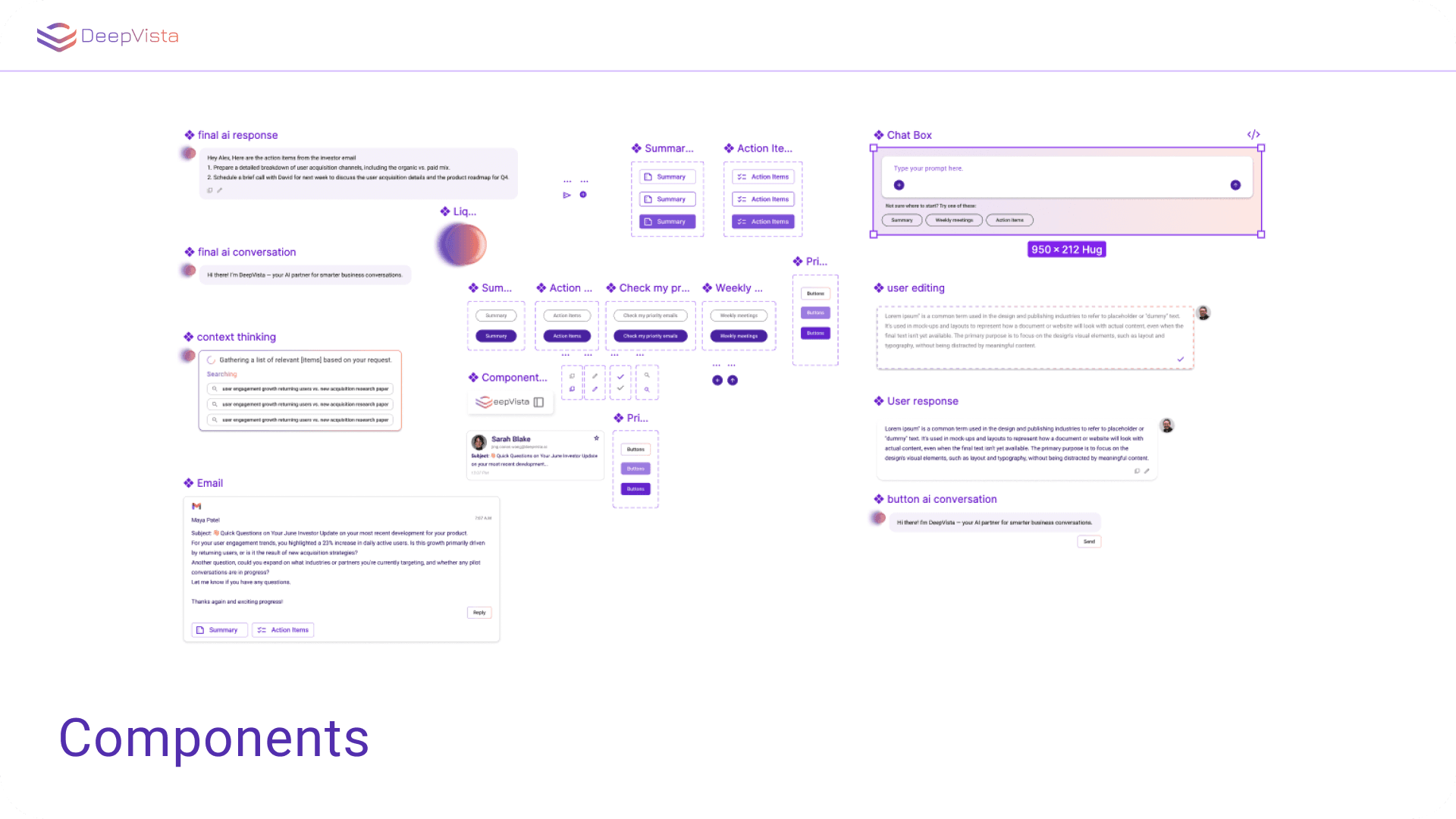 Components → Buttons, cards, chat panes, loaders, toggles — all in sync with our design system